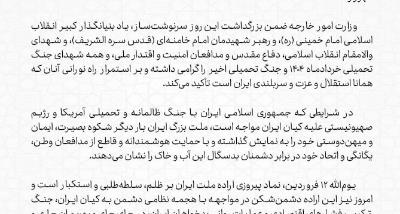 بیانیه وزارت امور خارجه به مناسبت روز جمهوری اسلامی ایران