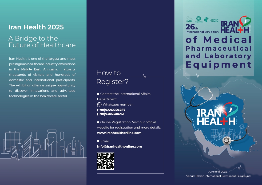بیست و ششمین نمایشگاه بینالمللی ایران هلث ( Iran Health ٢٠٢٥) به عنوان بزرگترین رویداد تخصصی در حوزههای تجهیزات پزشکی، دندانپزشکی و آزمایشگاهی در جمهوری اسلامی ایران در تاریخ 18 لغایت 21 خردادماه 1404 (برابر با 8 الی 11 ژوئن 2025) در محل دائمی نمایشگاههای بینالمللی تهران برگزار خواهد گردید. علاقهمندان جهت دریافت اطلاعات تکمیلی در خصوص این رویداد به وبسایت www.Iranhealthonline.com مراجعه نمایند.